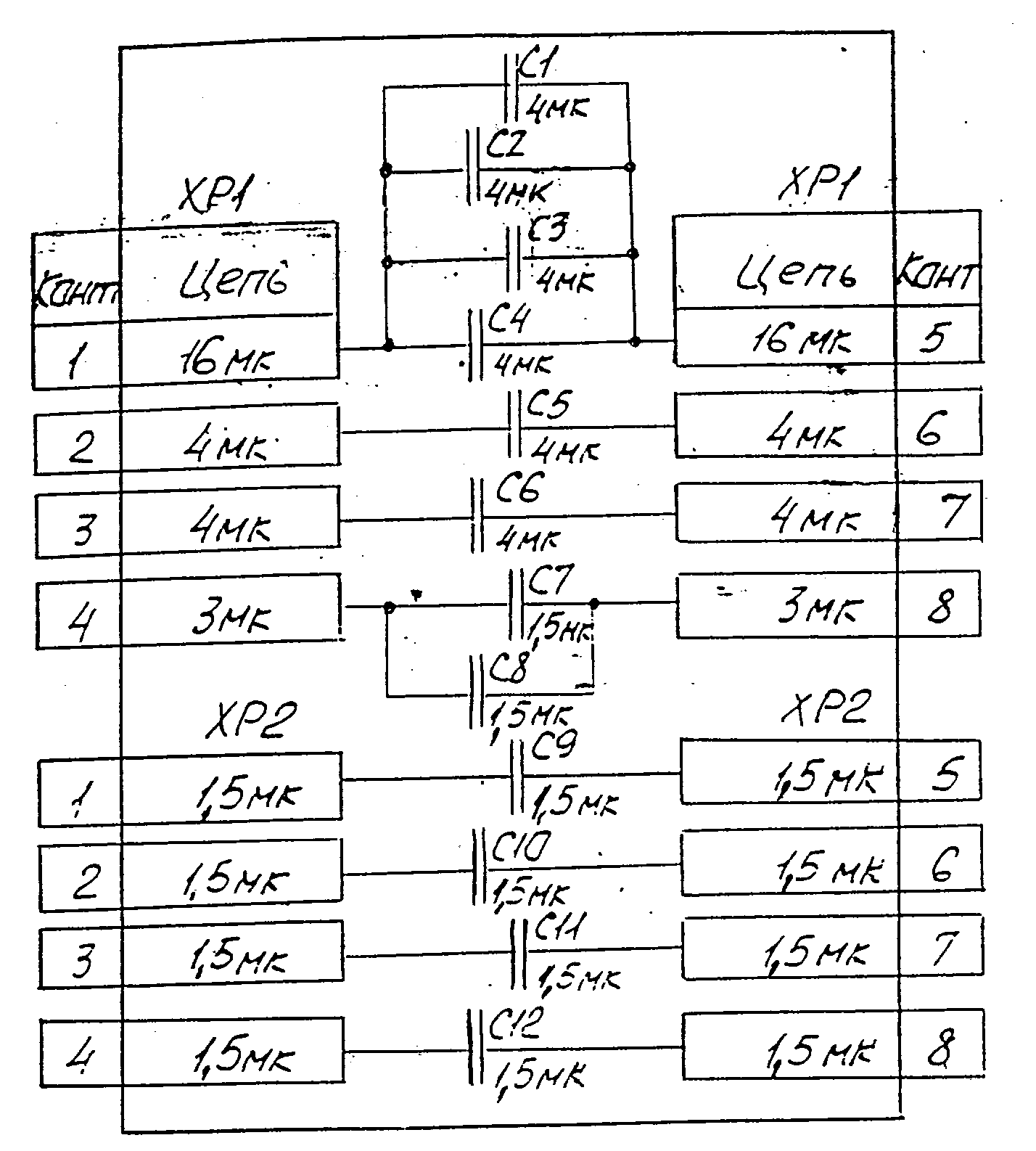7. Проверить настройку резонансного контура ДС-БК (фильтр 175 Гц) путем измерения величин напряжений переменного тока на элементах контура. Уровни напряжений на ДС и на БК должны отличаться не более, чем на 10%. При необходимости контур настраивается изменением емкости БК следующим образом: Если напряжение на БК больше чем на ДС - емкость увеличивают, если напряжение на БК меньше чем на ДС - емкость уменьшают. Изменение емкости блока БК производится установкой (удалением) соответствующих перемычек непосредственно на колодках БК. Принципиальная схема БК приведена на рис. 3. Виды блоков ДС1 и БК с лицевой стороны представлены на рис.1 и рис. 2, соответственно.