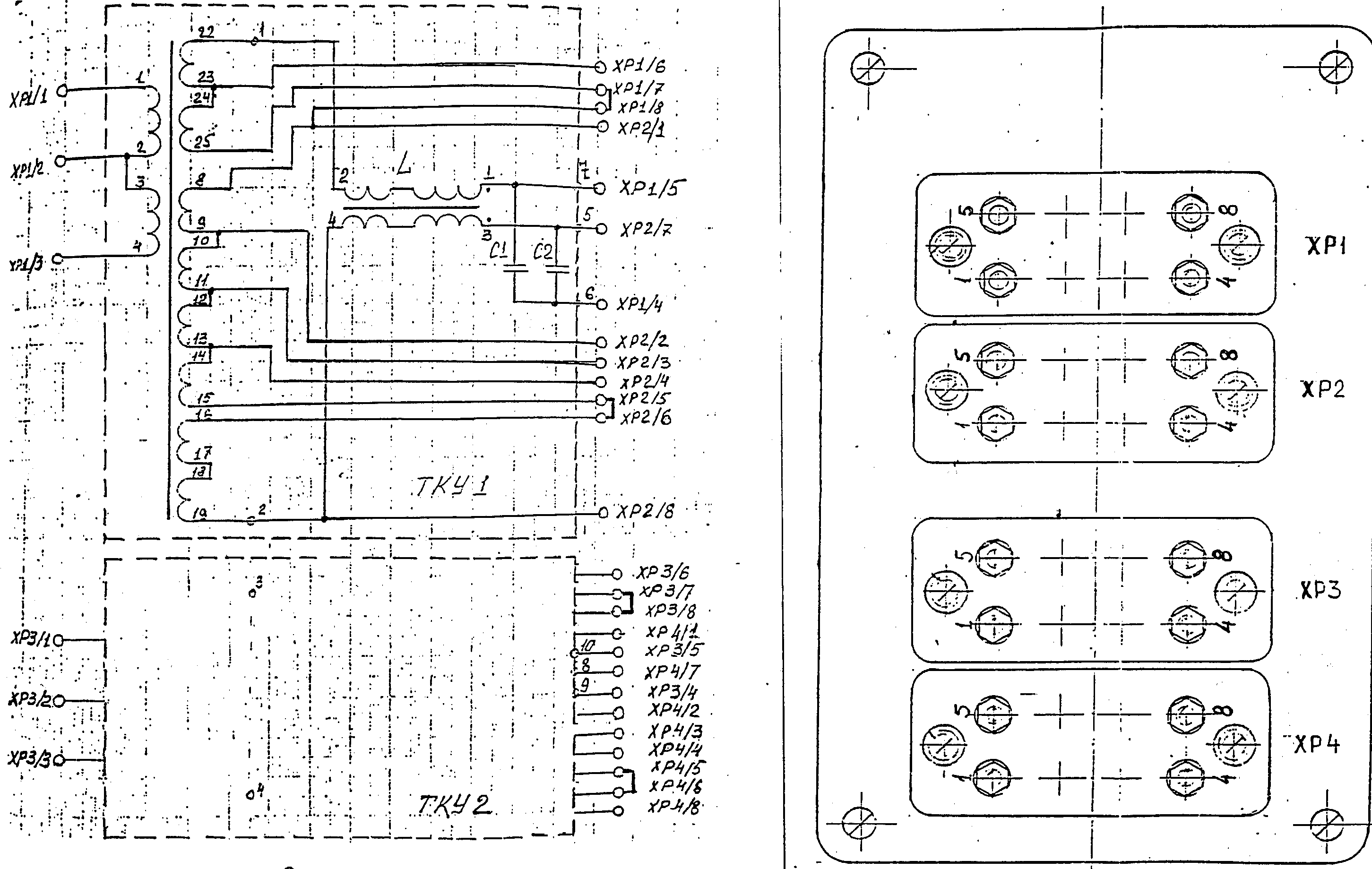 Входными выводами первого трансформатора блока являются выводы 1-1, 1-2 и 1-3, а второго трансформатора блока соответственно 3-1, 3-2 и 3-3. В обозначении выводов первая цифра указывает номер разъема, а вторая номер вывода, например, 1-3 означает разъем ХР1 вывод номер 3.